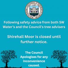 Following safety advice from both SW Water’s and the Council’s tree advisers Shirehall Moor is closed until further notice. The Council apologizes for any inconvenience caused.